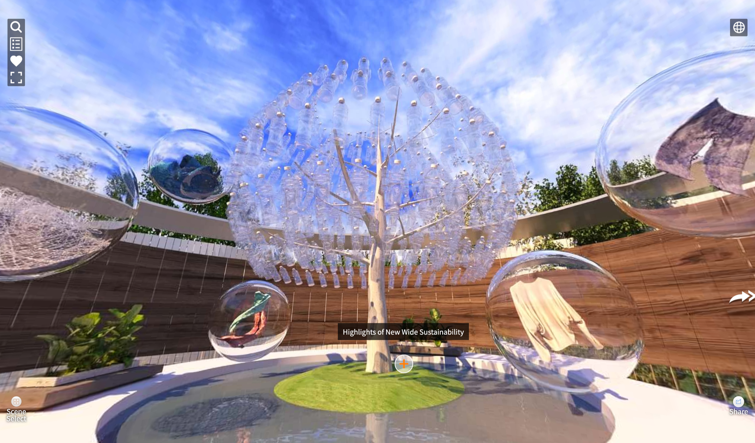 Upstairs, an imaginative installation of plastic bottle leaves represents our commitment to a fully circular system and social responsibility.