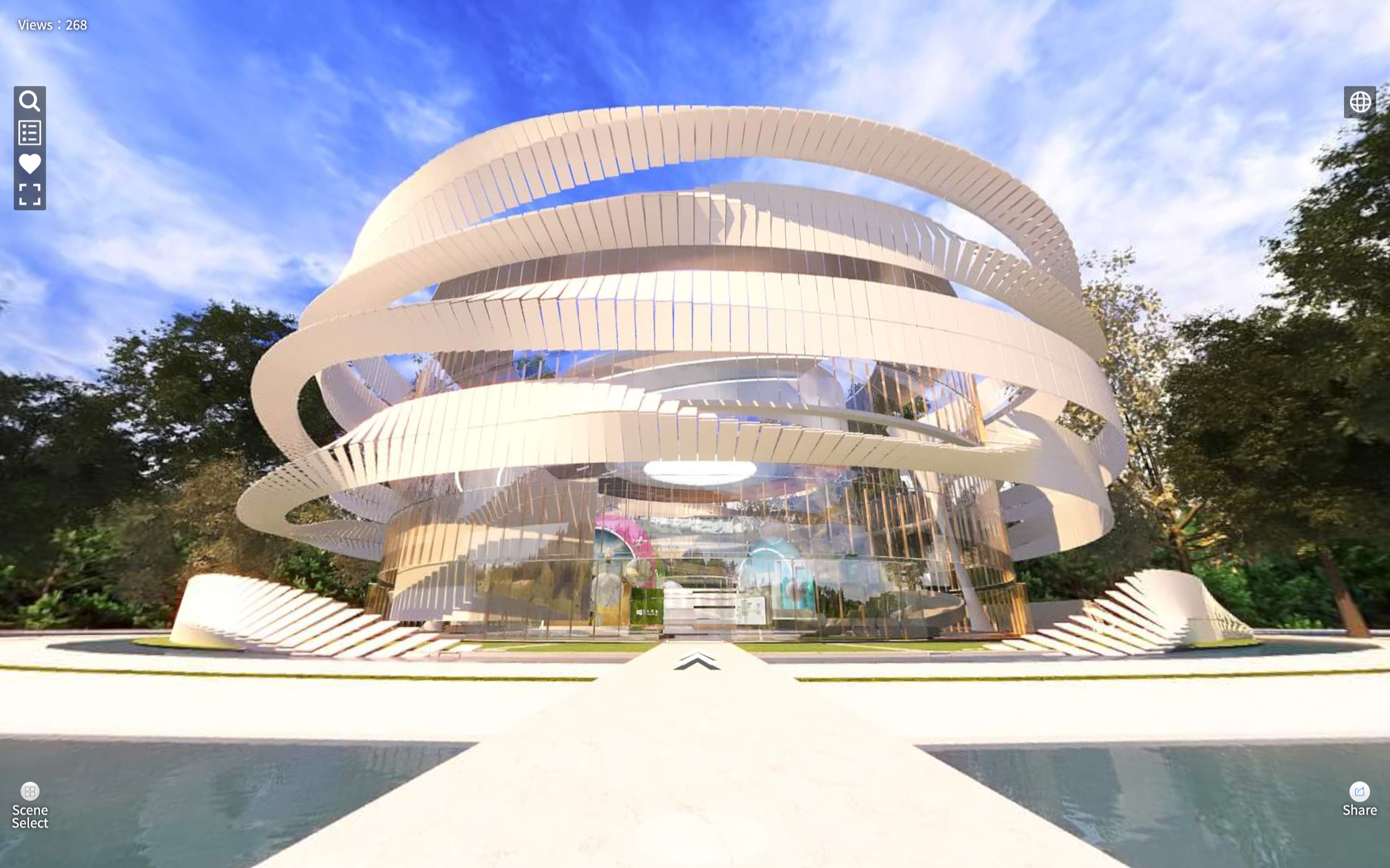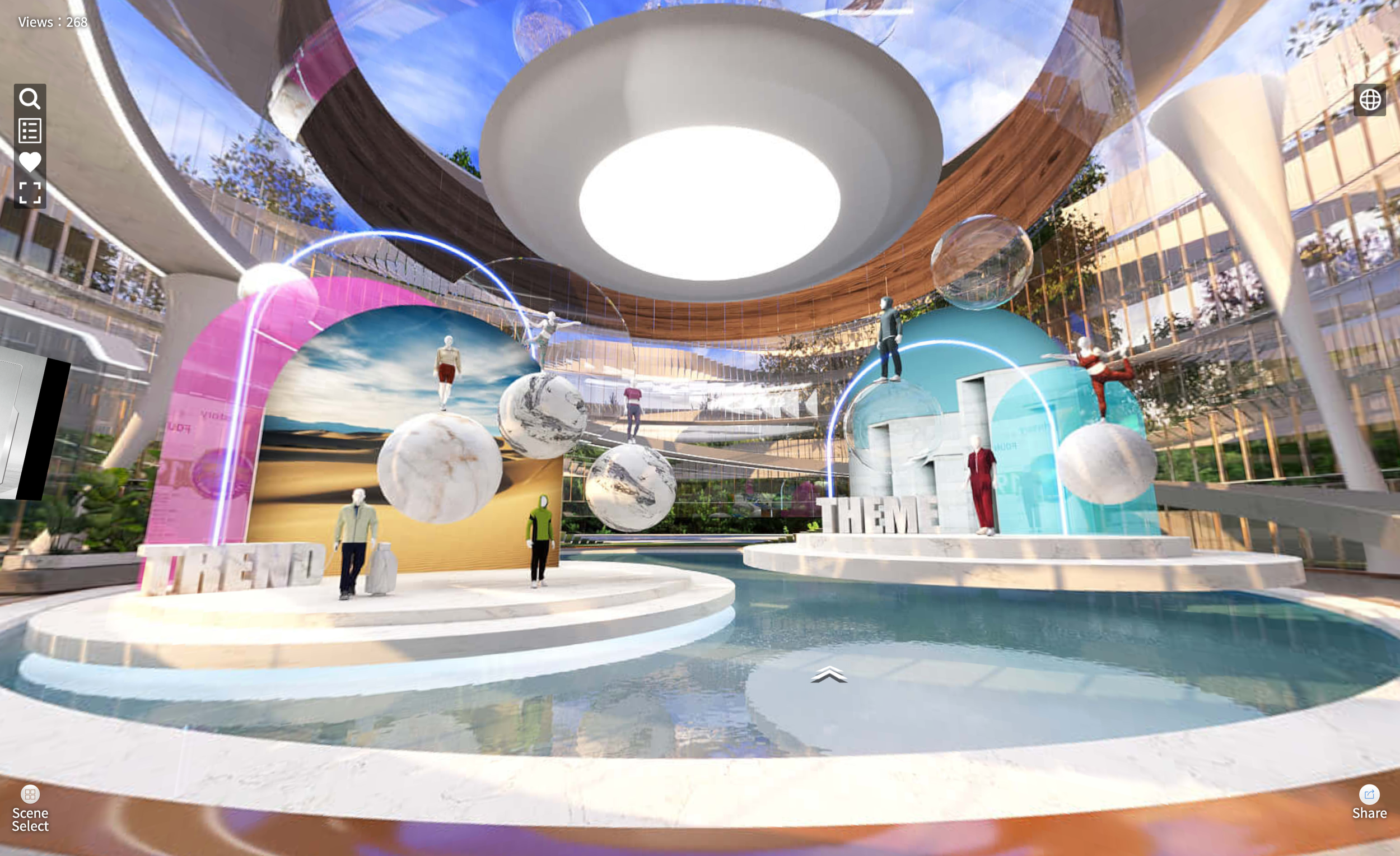 The showroom features a sleek, circular architecture that embodies innovation and continuity.FLOATING DIGITAL DISPLAYS